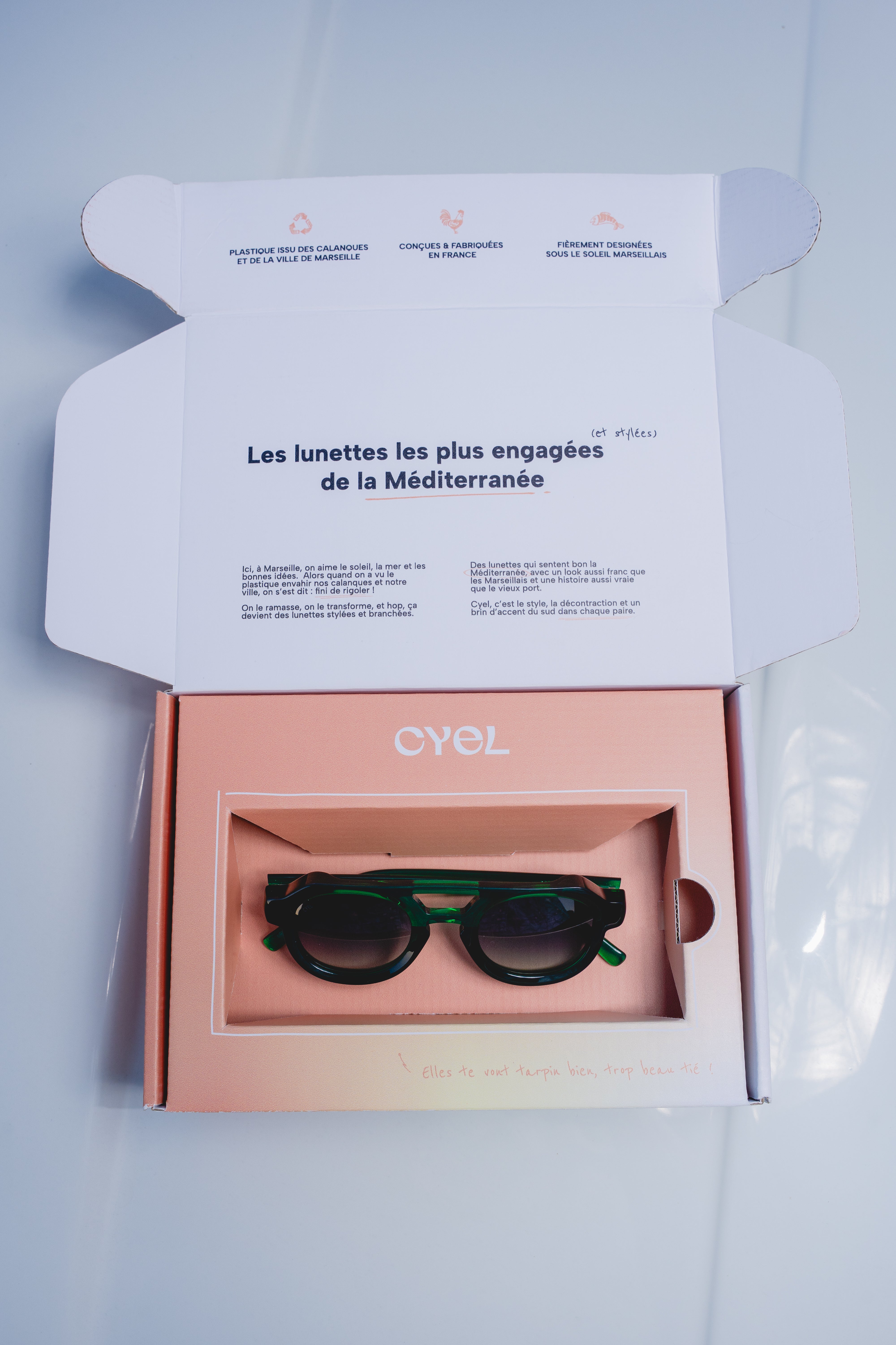 Le plastique est recyclé à Marseille, les montures sont assemblées à la main dans l’Ain, et les packagings viennent d’Annecy & des Yvelines.