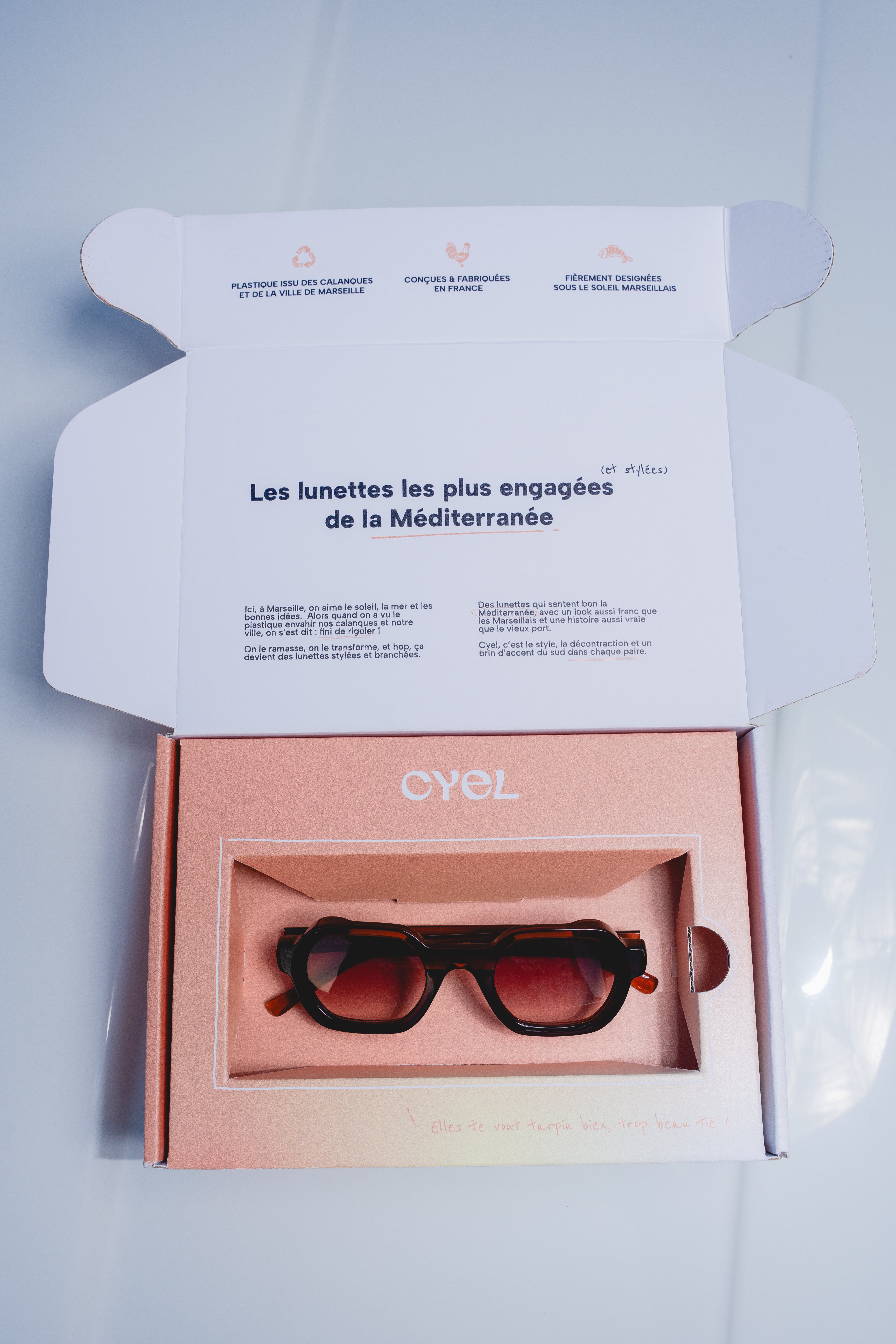 Le plastique est recyclé à Marseille, les montures sont assemblées à la main dans l’Ain, et les packagings viennent d’Annecy & des Yvelines.